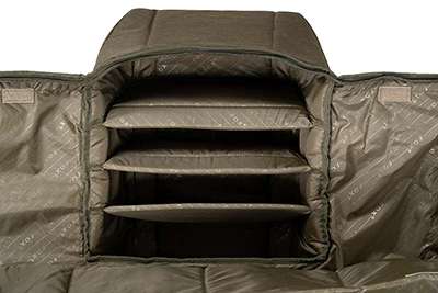 Incluye una amplia bolsa externa con cremallera ¾ ideal para transportar la red de aterrizaje y soportes de banco. Está fabricada en poliéster tratado 300D, resistente al agua y de alta durabilidad, perfecta para soportar condiciones exigentes en la pesca de carpfishing.