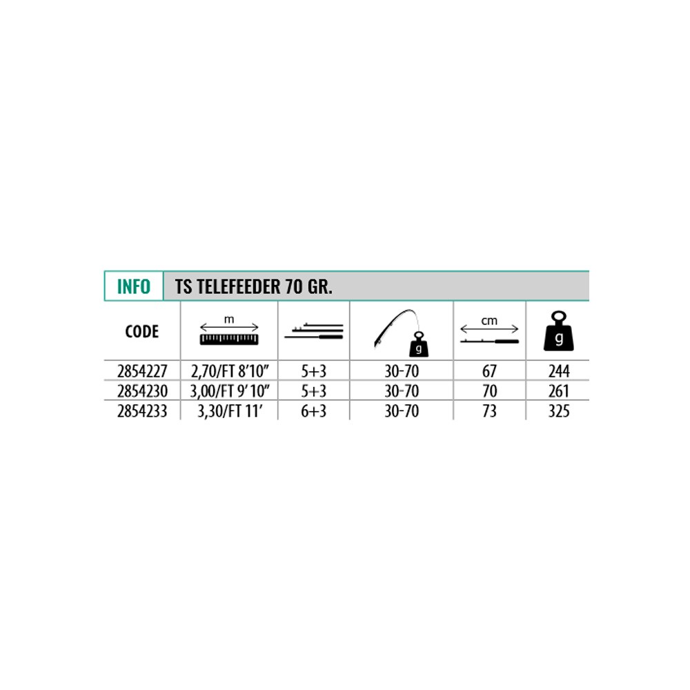 Caña telefeeder pro gr.30-70 3.30mts es una caña de feeder ultracompacta Lineaeffe Team Specialist Telefeeder construida en carbono 100%, diseñada para ofrecer precisión y sensibilidad en lanzamientos de 30 a 70 g. Incluye tres punteras intercambiables con extremos fluorescentes que mejoran la visibilidad de las picadas, adaptándose a diversas condiciones de pesca.