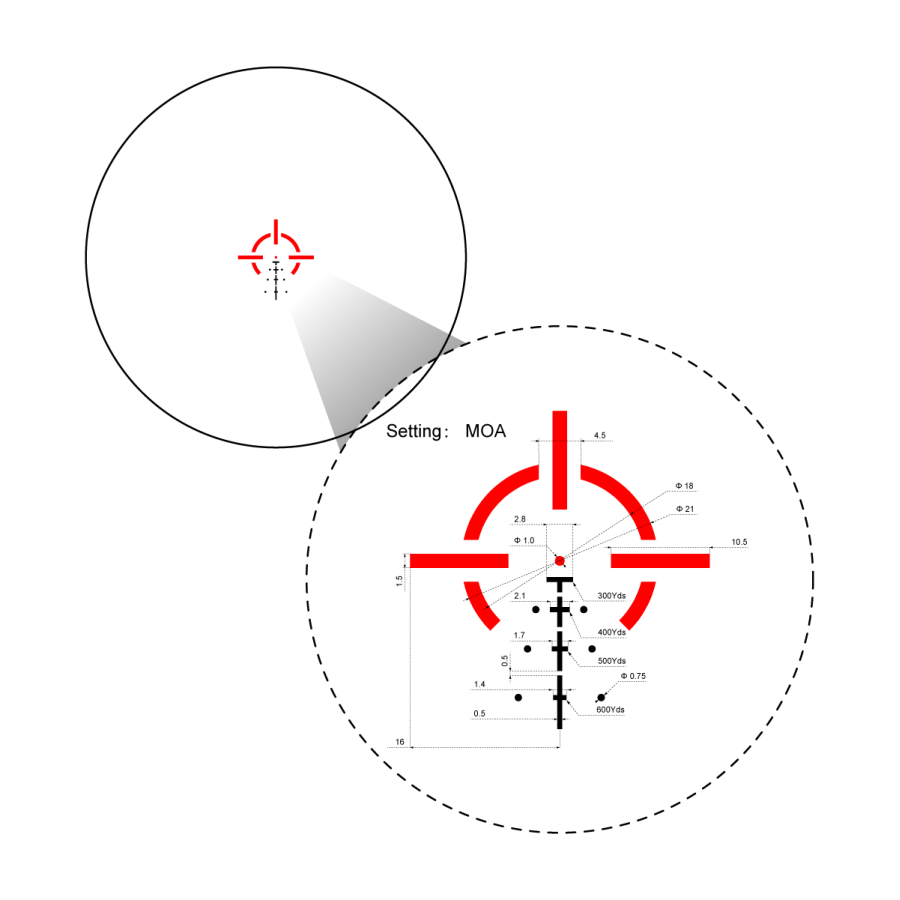 Su retícula grabada VEPS-MBR con punto central de 1 MOA permite una puntería precisa, mientras que el sistema BDC 0.223 facilita disparos rápidos hasta 600 yardas. Además, cuenta con 10 niveles de iluminación en color rojo para adaptarse a cualquier entorno, siendo especialmente eficaz para usuarios con astigmatismo al eliminar el efecto estrella típico de los puntos rojos convencionales.
