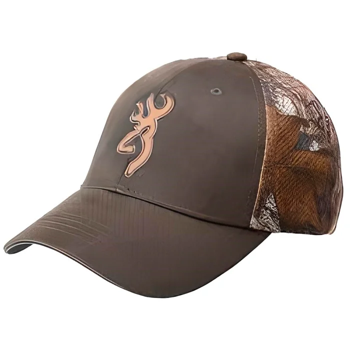 La gorra Browning marrón/camuflaje combina estilo clásico y funcionalidad para los amantes de la pesca y la caza. Su parte frontal y visera en tono marrón se complementan con un panel trasero de malla en camuflaje Realtree Xtra, que aporta ventilación y un diseño auténtico al aire libre.